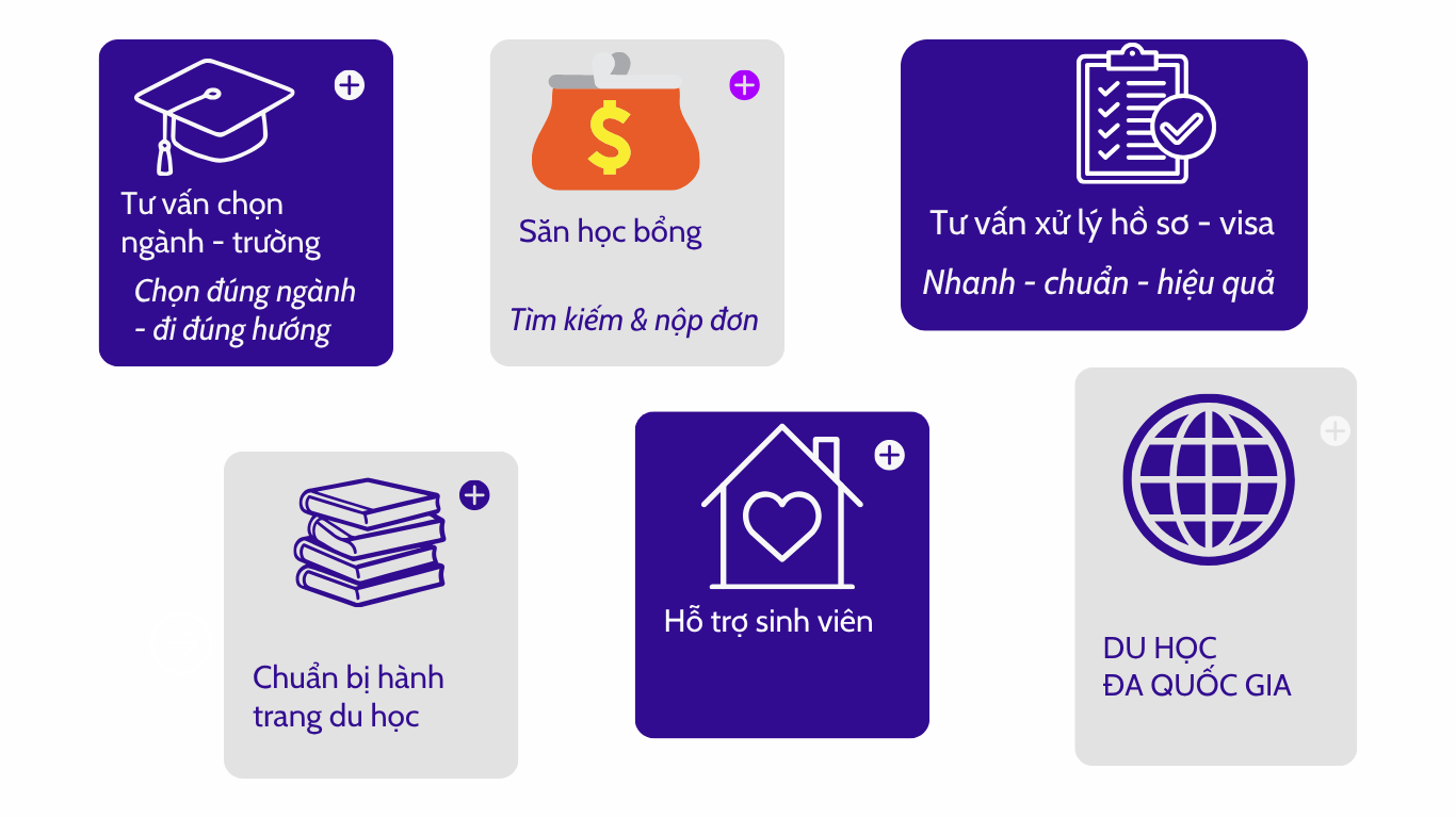 • Dịch vụ hỗ trợ sinh viên: Hỗ trợ sinh viên trong suốt quá trình du học, từ việc tìm chỗ ở, mở tài khoản ngân hàng đến giải quyết các vấn đề phát sinh.